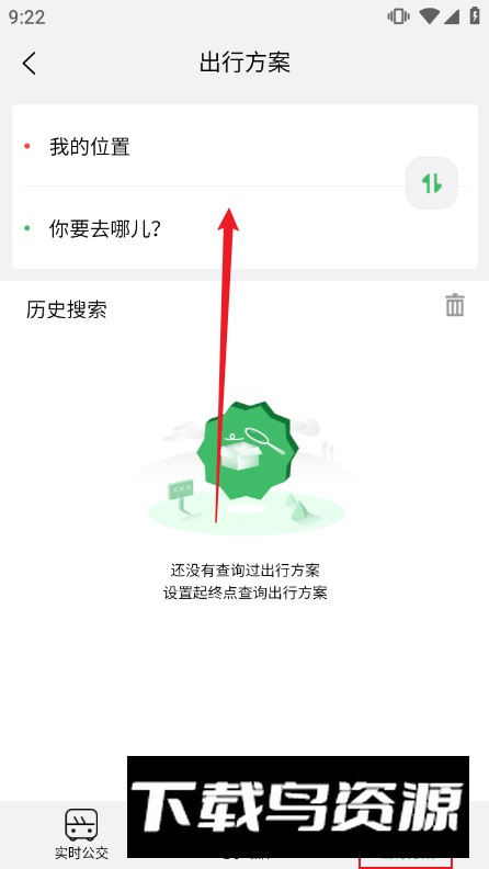 3、在公交页面输入起点与终点,系统将显示换乘方案与车辆实时位置。