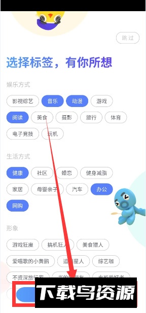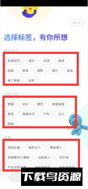4、在标签选择界面中,根据个人兴趣勾选娱乐、生活或形象等分类;