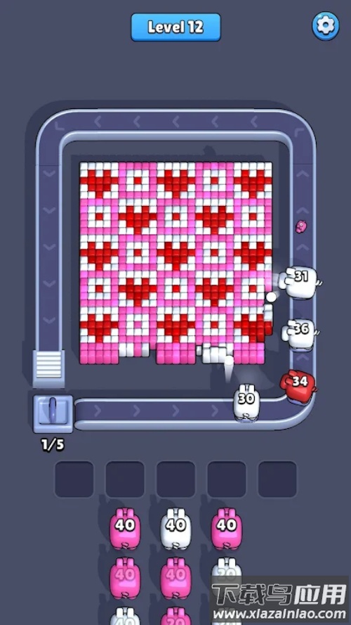 传送带上的小猪正等待发射,轻触传送带,它们就会冲向颜色相同的像素方块。