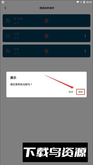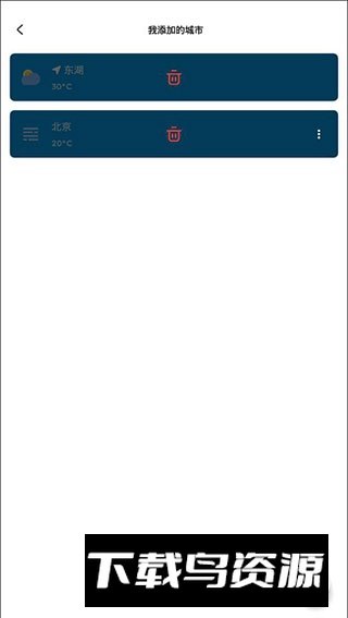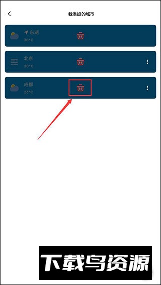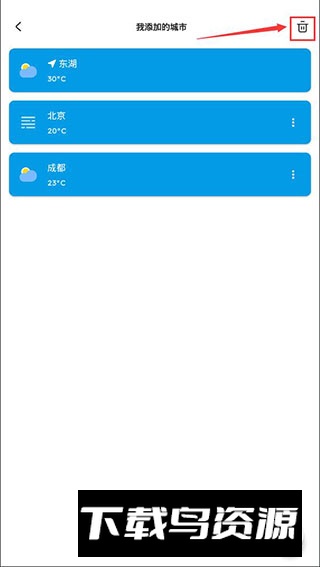 1. 进入“我添加的城市”页面,点击右上角的垃圾桶图标。