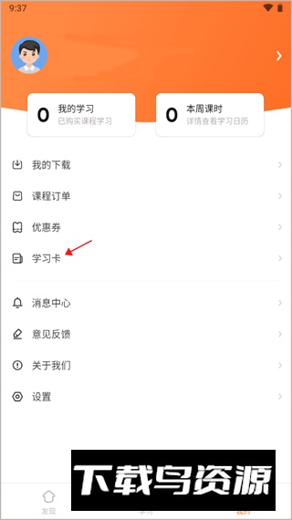 1、登录账号后,进入“我的”个人页面,找到并点击已购买的“学习卡”选项。