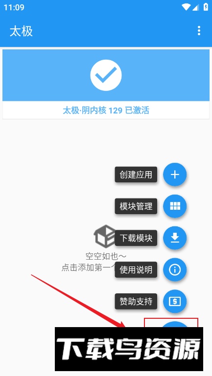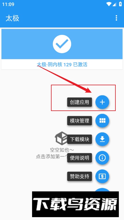 1、启动太极应用,在首页点击右下角“展开图标”,即可看到创建应用、模块管理、下载模块等选项。