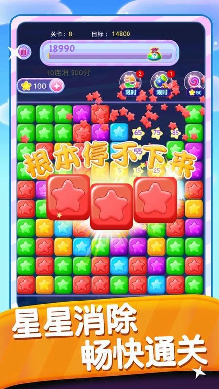 这款休闲消除游戏的核心玩法是点击两个或更多相同星星进行消除并获取分数;游戏设有大量关卡,可玩性突出。达到指定分数即可过关,消除数量越多得分越高,并且分数能够累积至后续关卡。
