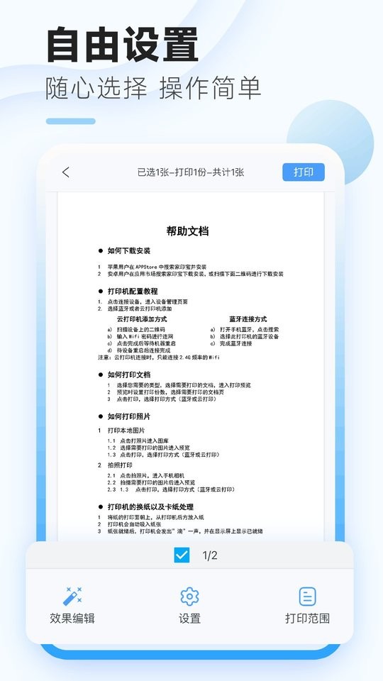 1.通过蓝牙或智能连接快速控制设备,实现一键打印;可同时管理多台打印设备,为家庭环境带来便捷高效的打印体验。