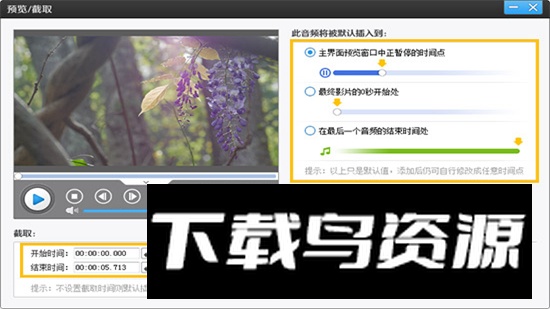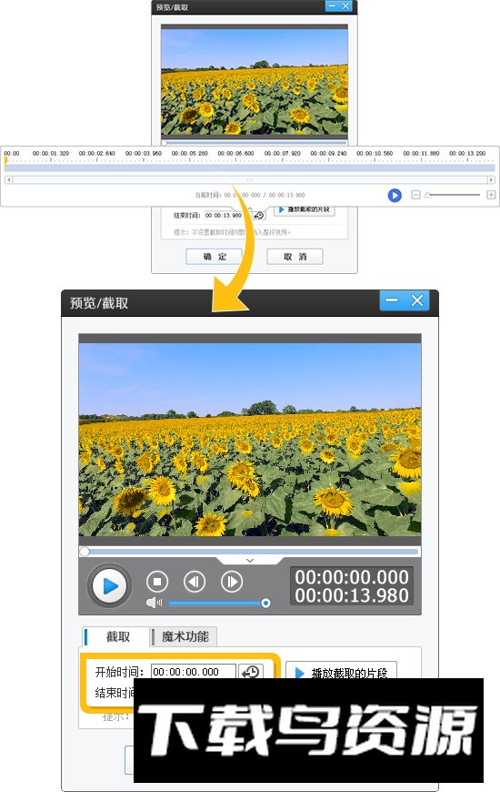 2、进入“预览/截取”界面后,通过拖动时间进度条选取目标画面,分别点击“开始时间”与“结束时间”旁的拾取按钮,就能快速设定片段起止点,完成视频截取。