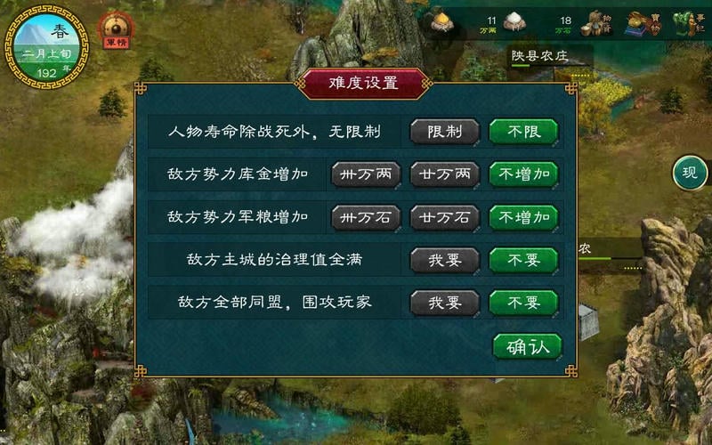 1、玩家需选择一个势力并扮演其君主,对内治理民生,对外拓展疆土;游戏采用大幅地图,对东亚地形进行了细致刻画,格局宏大。