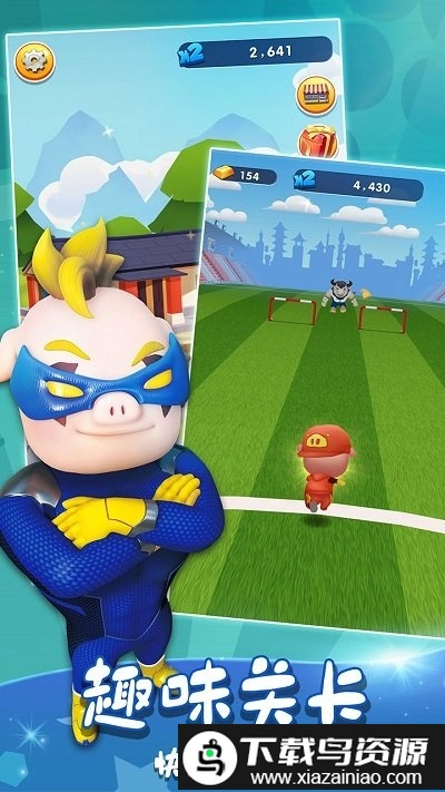 游戏中包含猪猪侠、菲菲与小呆呆等多个角色,并提供恐龙装、海盗装等激萌装扮供你挑选;各类道具均具备独特效果,善用它们能帮助你跑得更远更顺利。