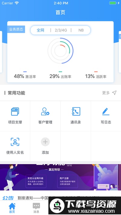 翼起物联app允许用户自定义添加常用功能,致力于提供最便利的操作体验;它包含客户管理、工作日志、内部通讯录、项目支撑与实名认证等多个核心模块,是中国电信专为内部员工打造的一体化工作服务平台。