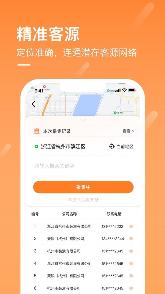 4. 附近客源功能可帮助用户采集数公里范围内的潜在合作商家或企业,直接有效地获取本地客源信息。