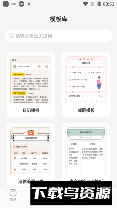 指尖笔记软件安卓版本为用户提供了丰富实用的记录模板,无论是追踪剧集进度、整理康奈尔笔记,还是撰写工作日志、管理日常账目,都能轻松应对。它内置了多种美观的排版样式与桌面小组件,操作直观便捷,所有功能均可免费体验,喜欢的不妨在本站下载。
