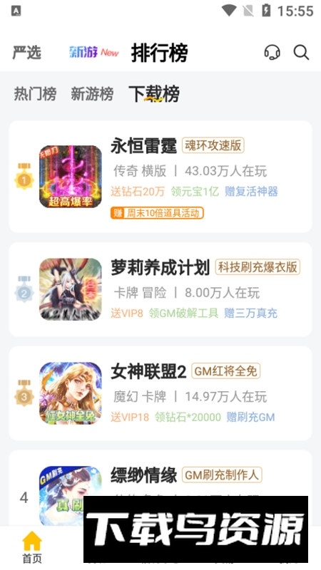 4. 切换至“首页”,参考热门榜、新游榜等榜单,选择喜欢的游戏下载体验。