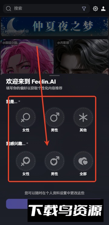 2、登录后根据指引选择性别与感兴趣的内容标签,完成设置即可进入主界面;