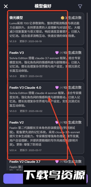 2. 模型库丰富多样:提供包括微光模型、FeelinV、Claude.0在内的多种AI模型,可根据不同对话场景灵活选用以获得最佳效果。