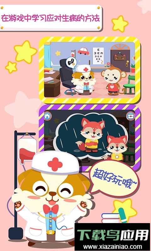 4. 游戏包含6位可爱的小动物病人和11类治疗小游戏,为宝宝提供生动丰富的医院体验。
