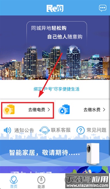 下载安装后打开民e购应用,进入首页点击去缴电费按钮。