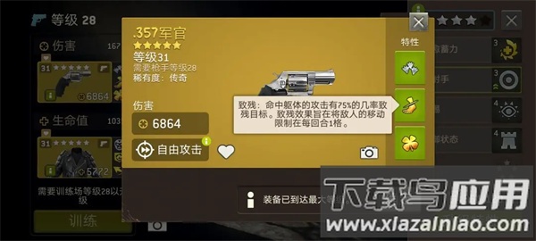 致残技能则不会因击中身体部位而被丧尸抵抗,且可受幸运加成。下图这把枪的致残技能几乎每次都能触发,尽管幸运加成概率显示为95%。这把武器虽射程不足,对付工会战中的自由人稍显乏力,但在挑战模式中风筝丧尸效果出色,对于防弹丧尸或免晕丧尸,都能用致残控制并灵活应对。