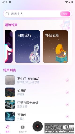 1、打开首页,浏览抖音热歌、网络流行、经典老歌等分类,查看铃声列表。