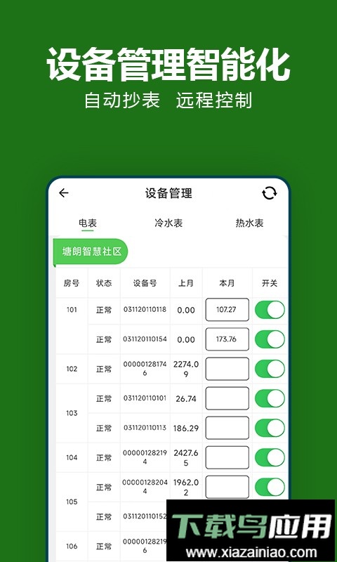 抄表猫管理端app是为平台运营人员设计的线上办公服务工具,借助该应用,工作人员能够更便捷地管理各类设备,包括电表、冷水表与热水表,均能实现远程操控。同时,该软件也提供房屋管理与财务处理等功能,助力日常工作效率提升。