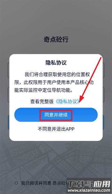 下载安装后打开应用,首先在隐私协议提示页面点击同意并继续按钮。