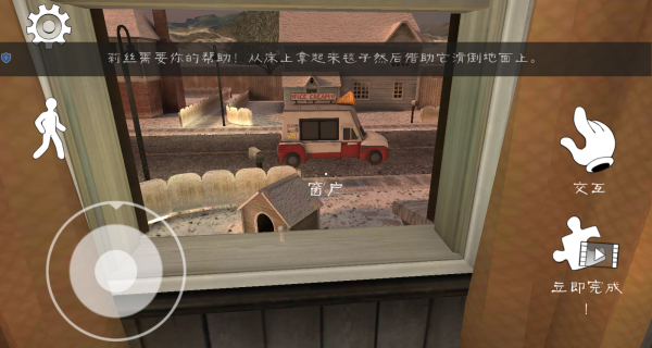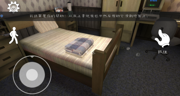 4、点击抓取键拾起毯子,然后利用虚拟摇杆控制角色移动,再次返回到窗户旁边。
