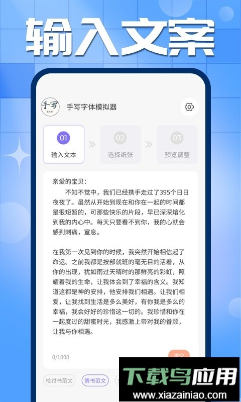 操作流程仅需三个步骤:首先输入所需文本内容,接着挑选合适的纸张背景,最后精细调整字体样式、大小及行间距等参数;即可轻松获得极为逼真的模拟手写字迹。
