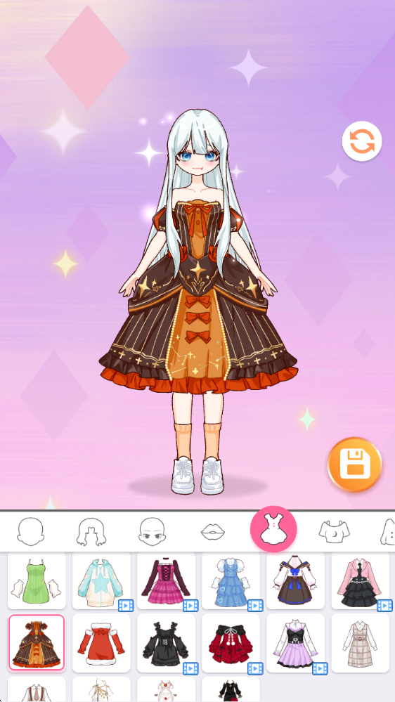 3、完成头部设计后,接下来可以挑选各式各样的服装,比如一条优雅的连衣裙。