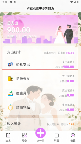 该应用专注于服务婚礼筹备过程,协助新人记录婚庆、礼服摄影等各类花销。