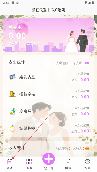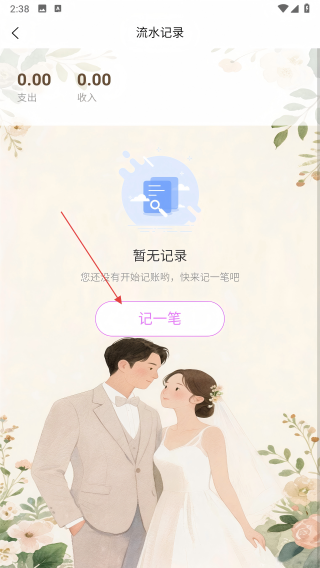 2.在流水记录页中,找到【记一笔】按键点击,进入婚礼开支记账界面。