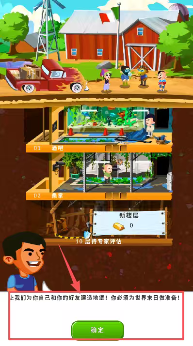 2、查看农场与地堡界面,点击绿色确定键,即可开始与好友共同建设末日地堡的旅程。