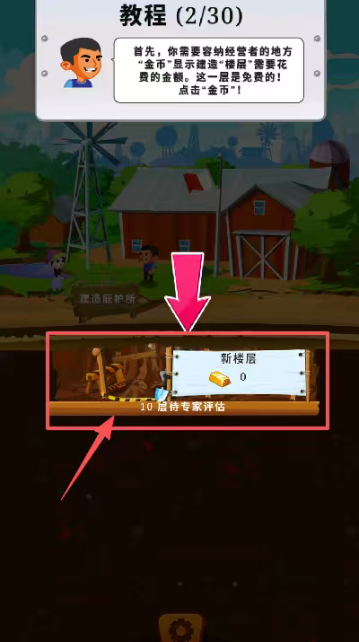 3、跟随教程进入地下区域,点击画面中的金币建造免费楼层,迈出游戏建造的第一步。