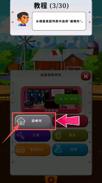 4、在灰色弹窗中选择楼层类型,点击灰白色的避难所按钮,依据提示完成楼层功能的选定。