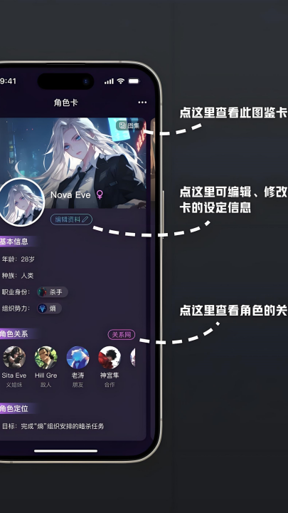 1、快速生成角色图鉴:只需输入基础灵感,软件便能协助你拓展成丰满的设定。