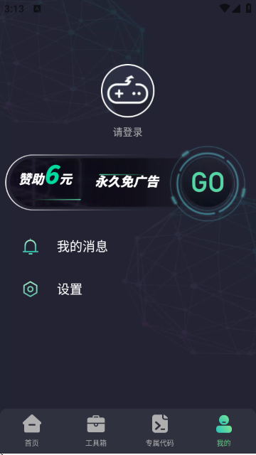 在“我的”页面中,可以登录个人账号。也可以选择赞助少量费用以永久去除广告。同时,这里还能查看消息通知并进行软件的相关设置。