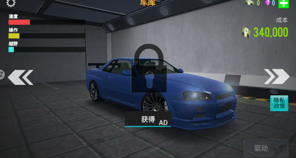 4、你可以进入车库界面,通过观看广告或使用赚取的金币,来解锁更多不同的车辆。