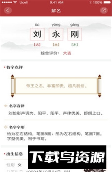 3.【专业起名】由专业命理大师提供解名支持;一键查询姓名相关的拼音、笔画、五行、吉凶及字形意义解析,让用户快速透彻地理解名字的好坏。