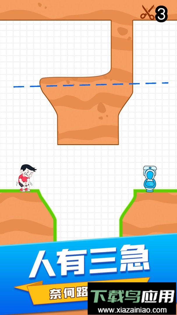 这是一款休闲益智游戏,核心目标是帮助内急的主人公顺利抵达马桶。面前的道路布满深坑,而角色已经忍无可忍。你的任务是通过画线切割头顶的障碍物,利用掉落的材料填补路面缺口。玩法易于上手,但关卡设计精巧,对判断和操作有很高要求,难度逐步提升,等待你的挑战。