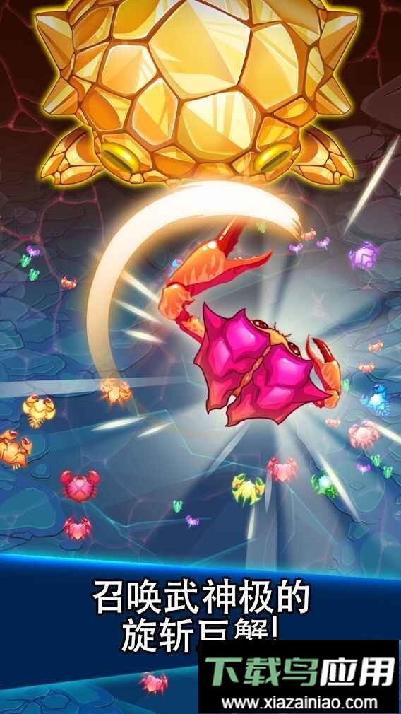 借助不同螃蟹攻击巨型怪物,夺回家园;通过在屏幕布置大量小螃蟹来累积攻击力,游戏过程中还会收获各种装备。