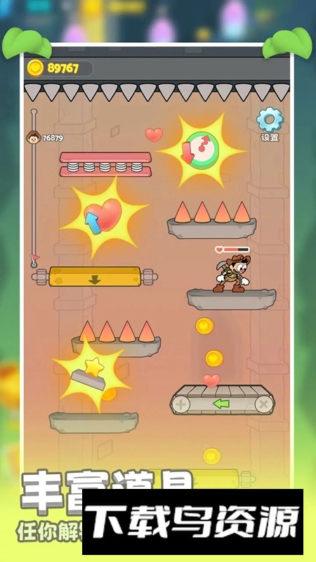 3.收集道具与金币系统:在冒险旅途里,玩家可以搜集多种实用道具与闪亮金币;道具能协助应对复杂机关,金币则可用于购买装备或提升角色能力。