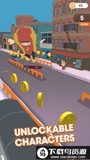 1、围绕滑板主题展开,玩家需在不同赛道上冒险炫技,在滑行过程中收集金币;