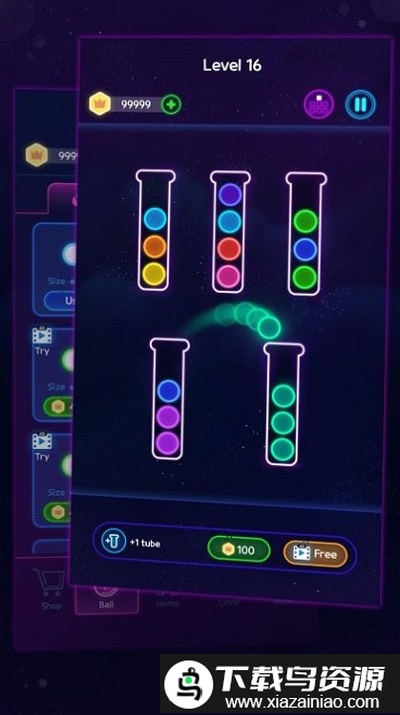 3、拥有彩色发光主题皮肤,游戏完全免费,并可通过获取更多皮球来增加通关机会。