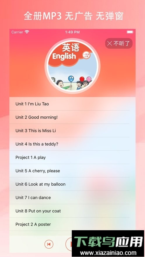 播放功能设计合理,能够单独朗读课文中的单词或句子。用户可自定义复读模式,并调整播放速度为慢速或快速。