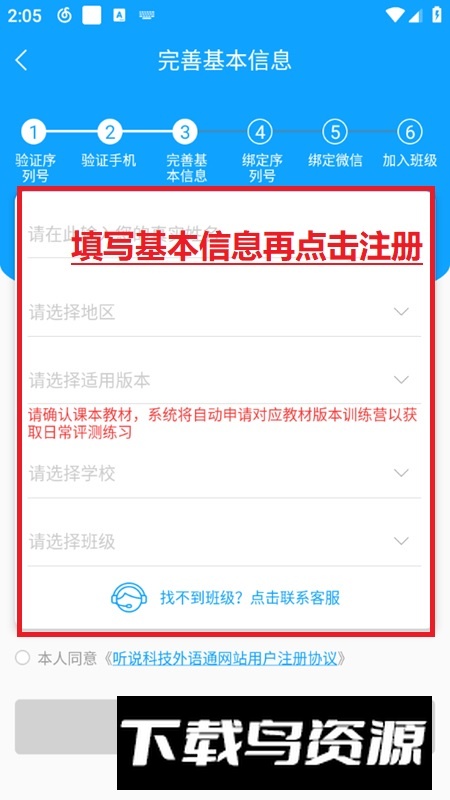 4、填写姓名、学校、地区、班级等基本信息,勾选同意用户协议,完成注册。