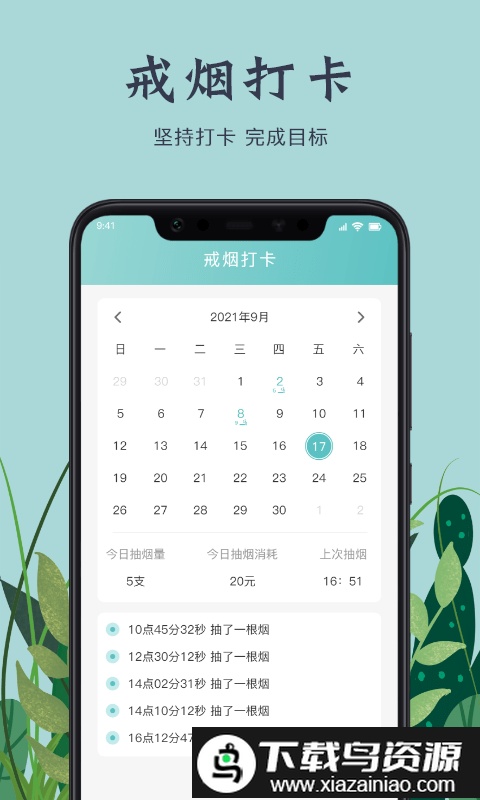 记录每日吸烟数量并坚持打卡,这款应用能帮你完成个人设定的控烟目标;它会自动计算抽烟花费的金额,同时提供科学合理的戒烟方案,协助用户逐步减少依赖;有需要的朋友可以直接在本站下载使用。