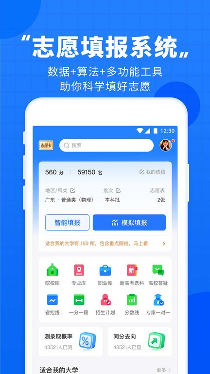 输入分数后,依托大数据与人工智能技术,预测院校录取概率;集成多种实用小工具,协助完成高考志愿规划,操作智能且高效。