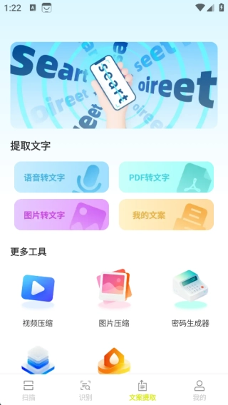 4、在文案提取页面中有提取文字功能,还有各种更多工具。