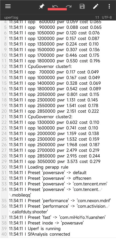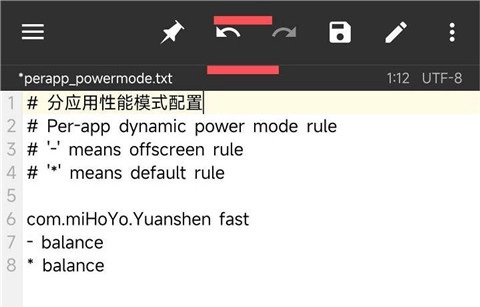 一、使用MT管理器打开路径/storage/emulated/0/Android/yc/uperf/per_powermode.txt,参考图二:“#”符号之后的内容是注释说明,下方需按“包名 空格 模式”的格式进行设置——作者已默认将原神设为极速模式,可选模式包括