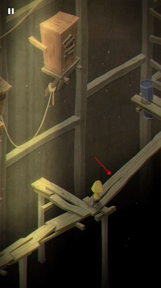 6、摩诺躲过桶,向楼梯往上爬,用力将这两块木板搬掉,就可以进入到下一个关卡了。