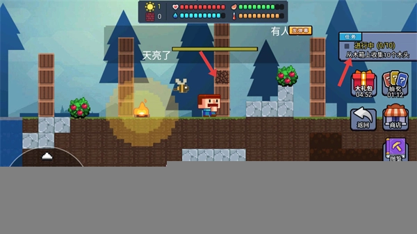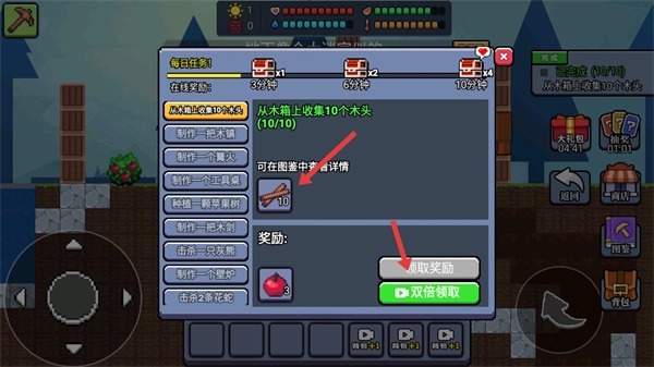 3、打开任务界面能查看每日任务,像从木箱收集木头这类,满足任务要求后,点击领取奖励就能得到道具或资源。