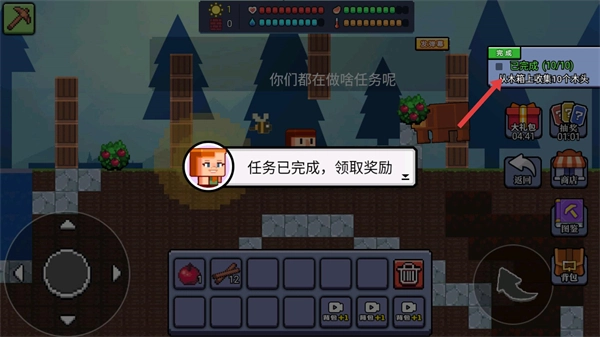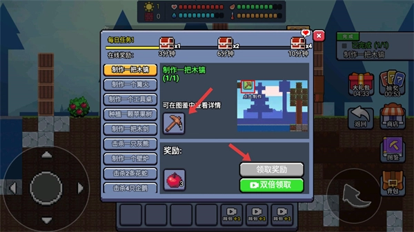 4、在任务界面里,尚未完成的任务会展示进度情况。以制作木镐的任务为例,你可以按照提示去收集所需材料并完成制作,完成之后就能领取相应的奖励了。