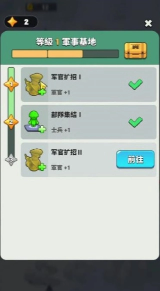 1、玩家将化身前线指挥官,从最基础的军事基地着手建设,通过持续升级设施和解锁功能,逐步构建并完善自身的军事体系。